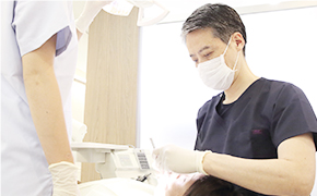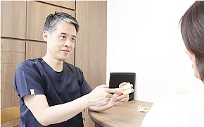 歯科クリニックに来られる患者様は、多かれ少なかれ緊張されています。そのため、患者様に対して緊張感を与えないようにお話することが大切だと考えています。お口の健康は身体全体に影響するものであり、ご自身のお口の状態を知ることはとても重要なことです。いつまでも健康な歯でしっかりと噛めるよう、当クリニックでは患者様のお口の状態をわかりやすく丁寧に説明させていただくことに重点を置いています。